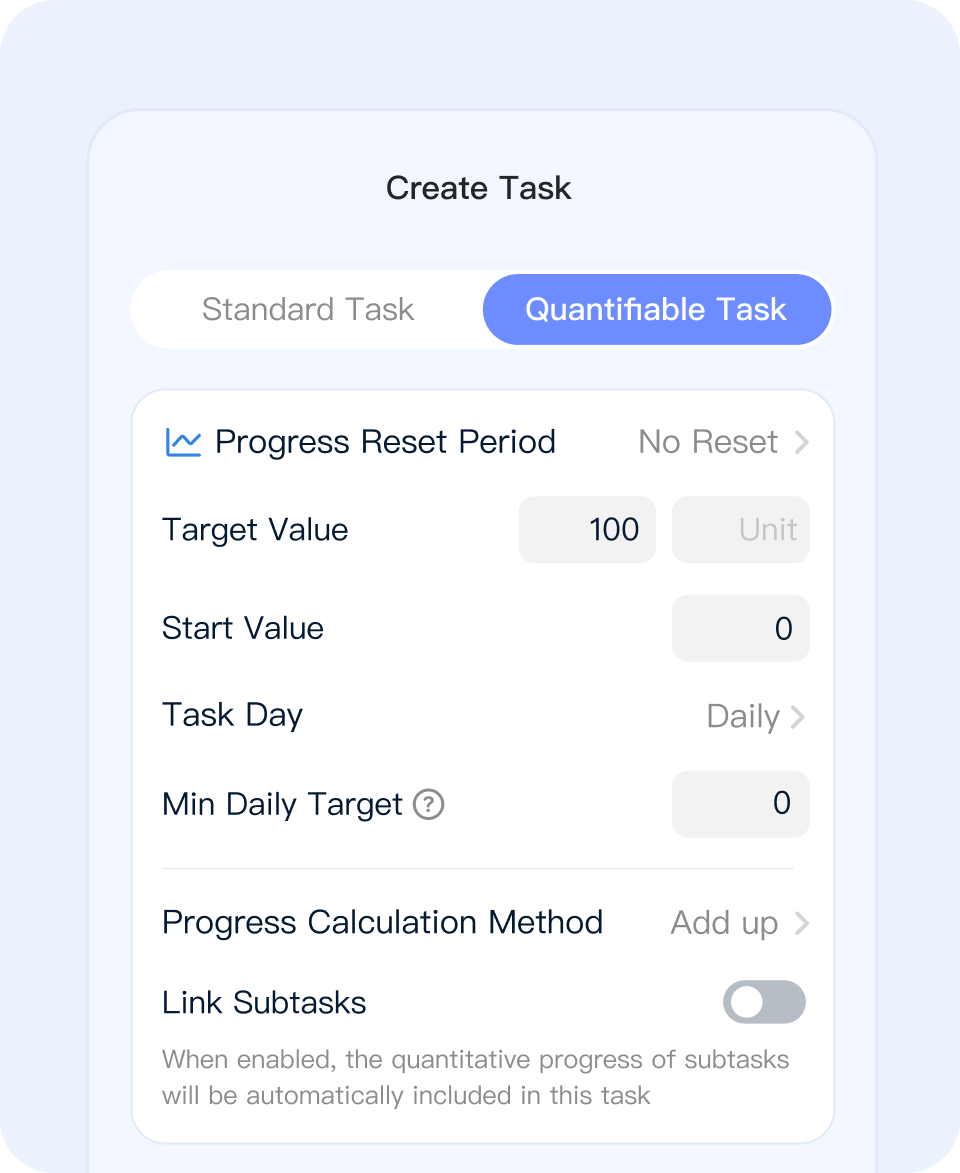The core of a progress task is simple: keep recording numbers, and the app calculates your current progress.