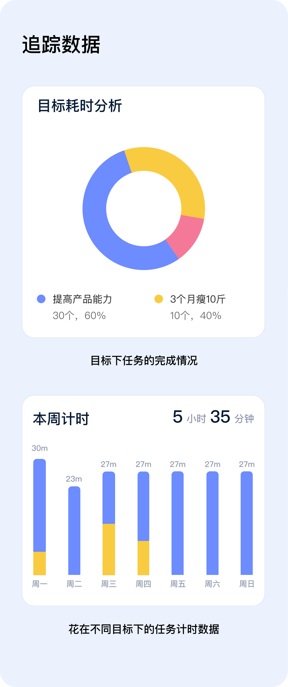 - 不同目标的时间分布,帮助你了解精力投入是否平衡