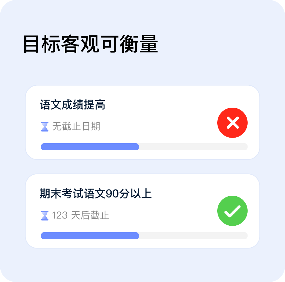 例如:“完成毕业论文初稿”,比“论文”更具体。 - 客观描述 —— 目标应当明确可判断,能清楚地区分是否达成。