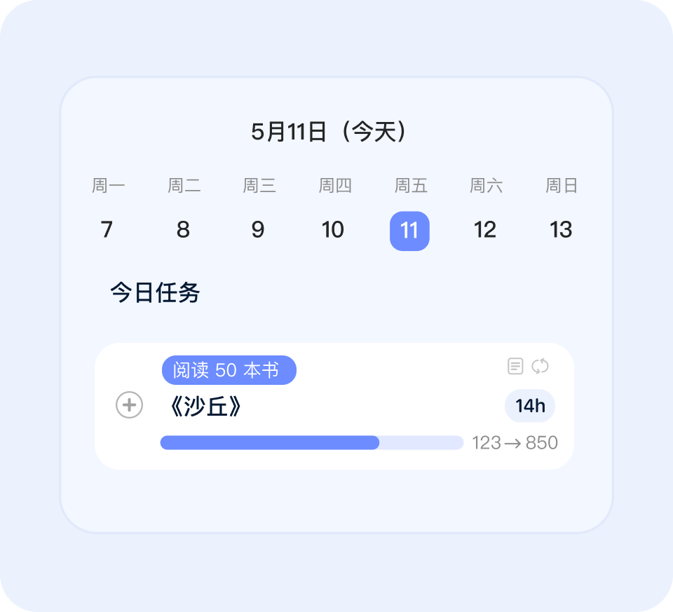 例子:读一本新书时,把开始值设为 0,目标值设为这本书的总页数。这样任务卡片就能实时显示你的阅读进度啦。