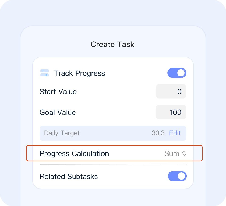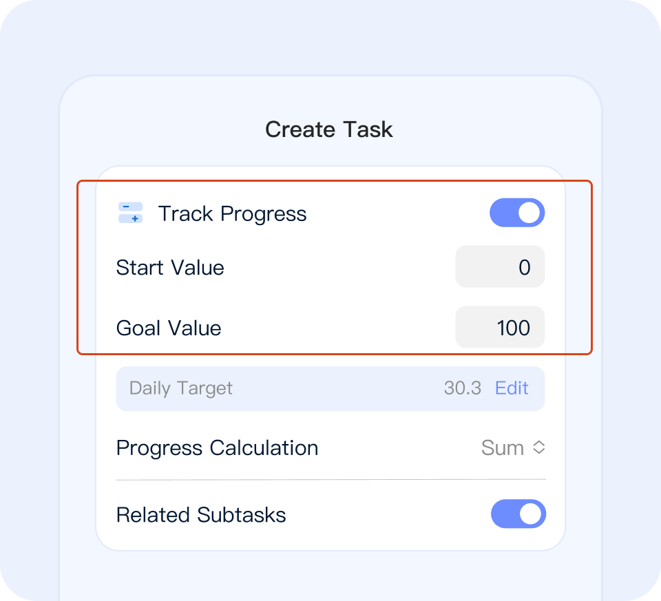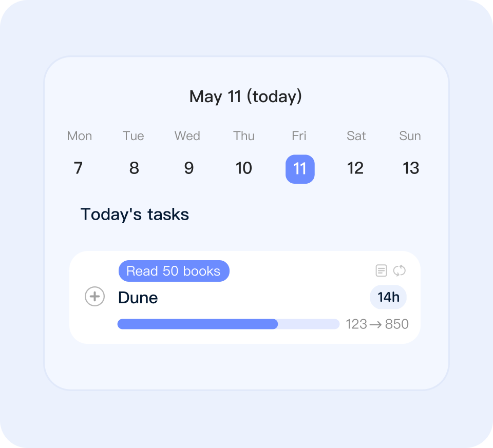 Example: if you’re reading a new book, set the starting value to 0 and the target value to the total number of pages. The task card will then show your reading progress in real time.